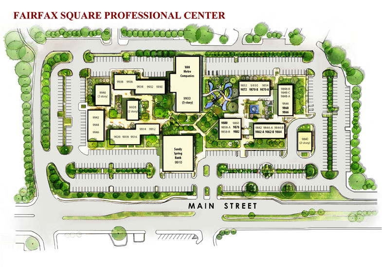 Fairfax Square Professional Center is a well-established office and semi-retail park. This 10-acre complex is made up of 14 buildings and features ample parking, water features, and gathering areas making it the perfect place to visit. The management and facilities team take great care and pride in maintaining the park-like setting as it has been home to a variety of businesses and commerce for over 30 years. The Center was built in phases, first in 1978 and the second completed in 1980. Finally, it was finished with the addition of the 9900 Building completed in 1982. Currently, the campus includes several medical and wellness offices such as Zinnia Aesthetics, Dental One Associates, and Fairfax Eye Associates, as well as semi-retail establishments like Sandy Spring Bank, Sunny’s Deli, Grace Oak Salon, Sage Bridal, Fairfax Travel, and Lubin Photography. The diverse make-up of the center continues to flourish and will continue to support the needs of the community for years to come.